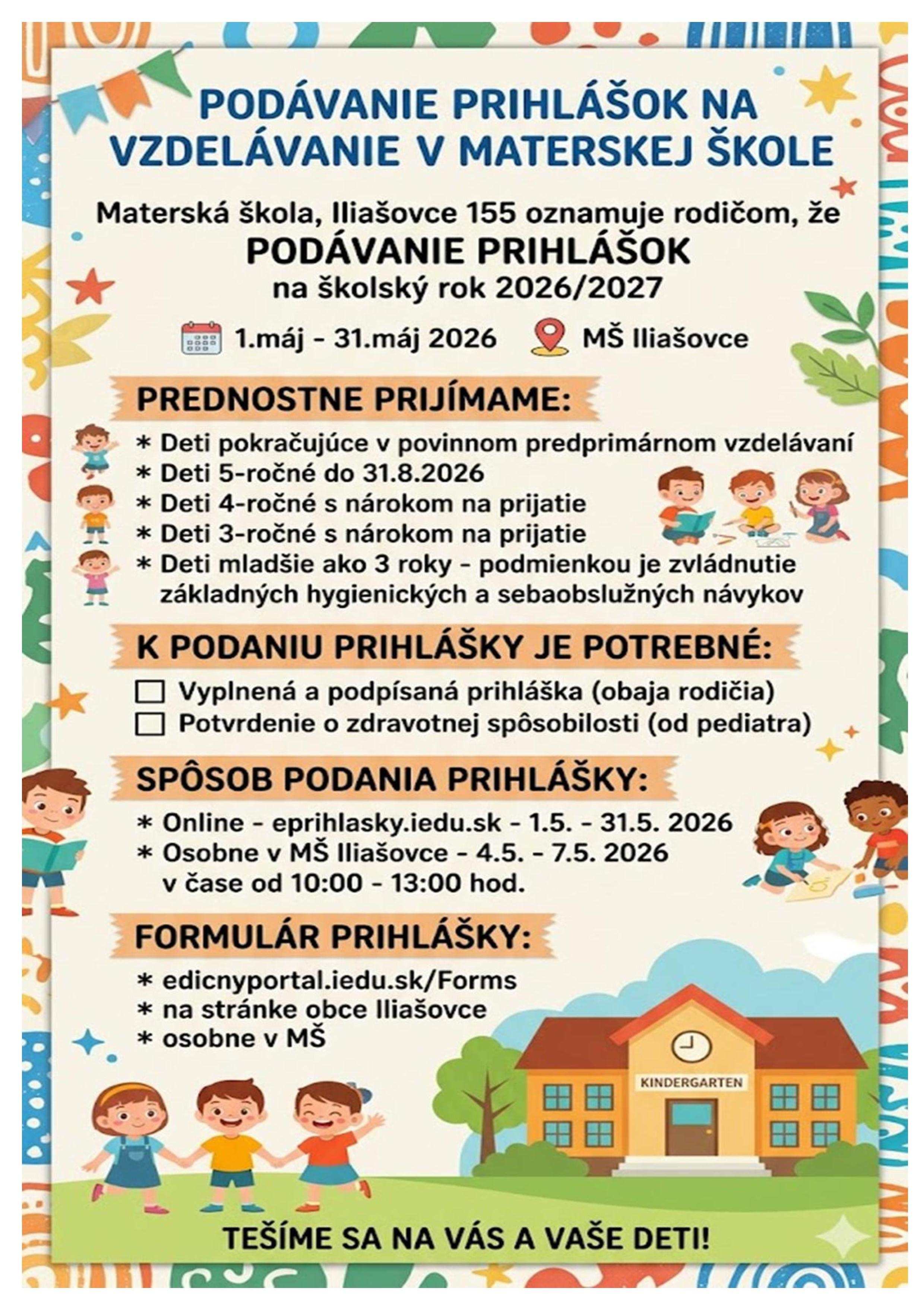 Oznam o podávaní žiadostí o prijatie dieťaťa na predprimárne vzdelávanie do materskej školy v zriaďovateľskej pôsobnosti obce Iliašovce na školský rok 2026/2027