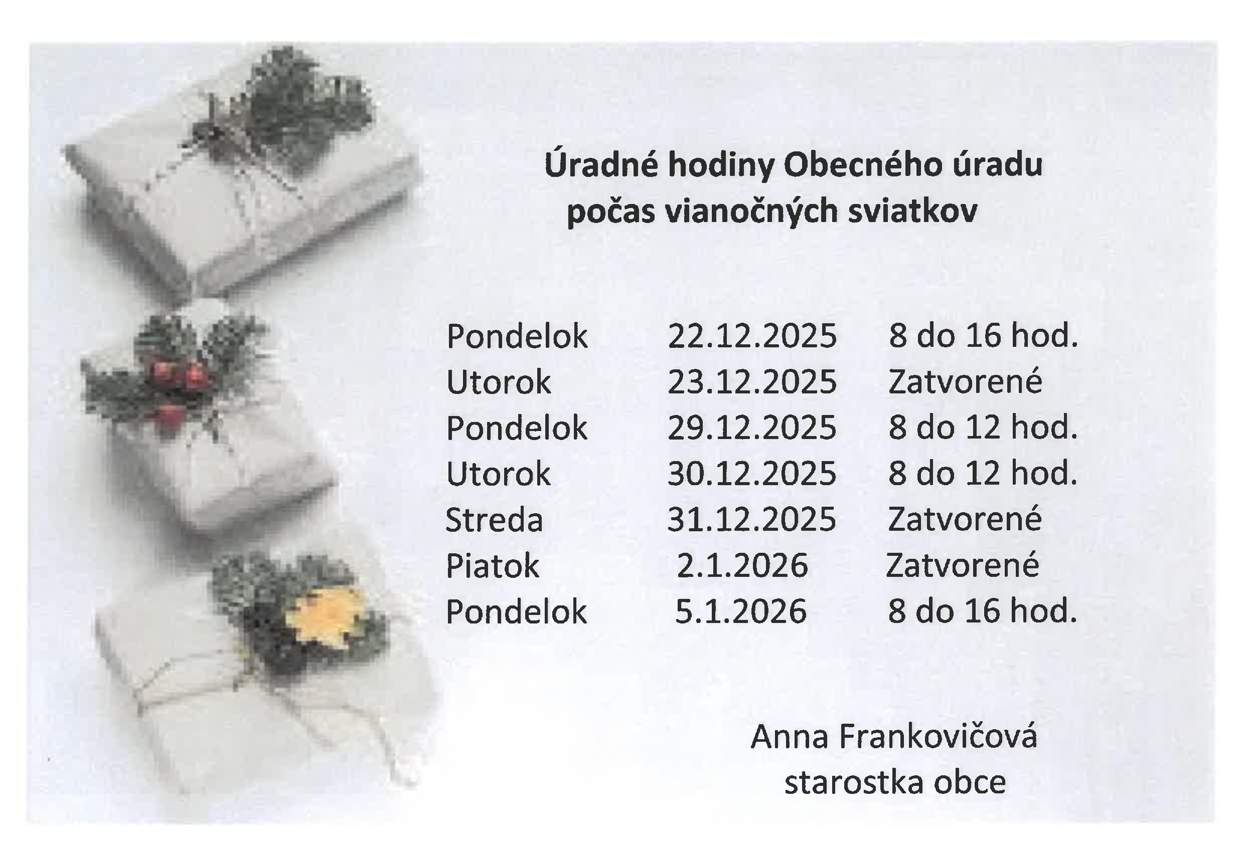 Úradné hodiny Obecného úradu počas vianočných sviatkov